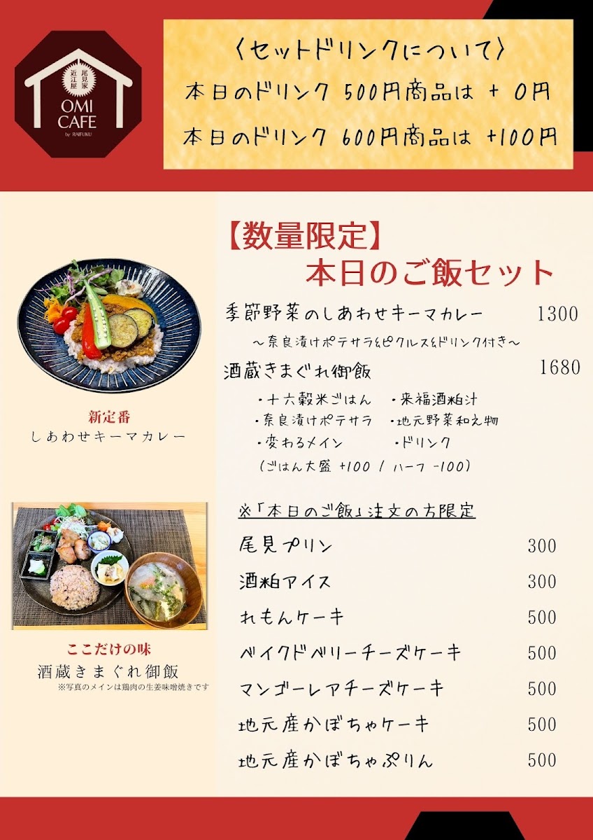 OMI CAFE's daily offerings ensure each visit brings something new, with options like Keema Curry paired with a refreshing variety of sides, including Seasonal Ratatouille and Potato Salad enriched with sake lees. Smooth, rich coffee brewed with sake-infused water adds an unexpected twist to your dining experience.